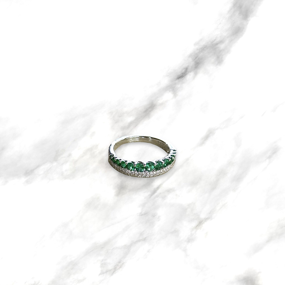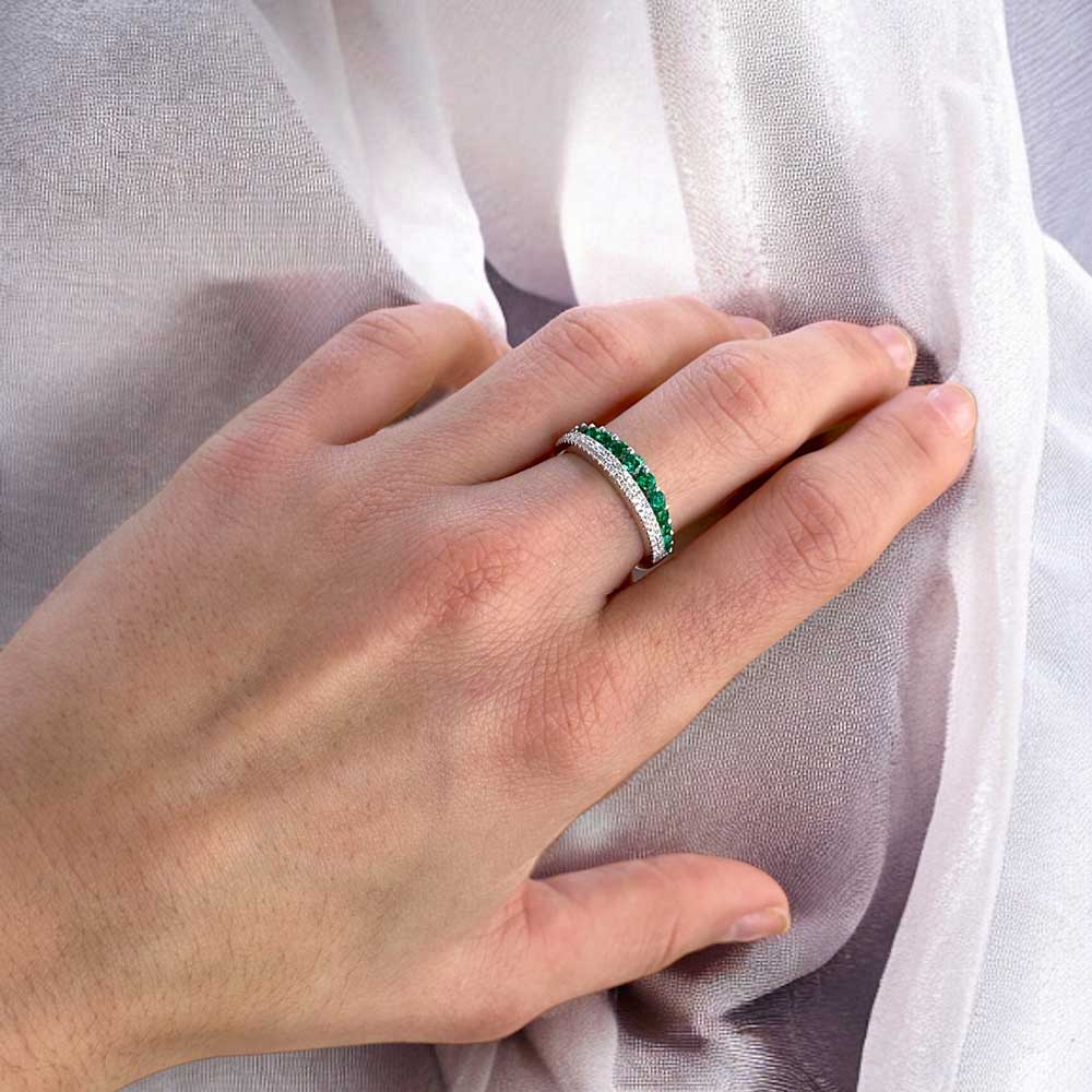 Anello a vera in oro bianco 18kt con smeraldi e diamanti naturali a degradare