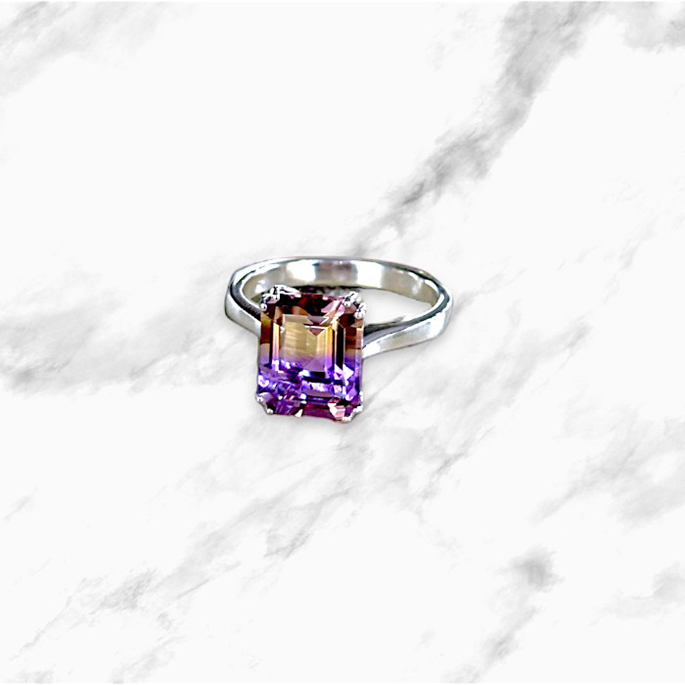 Solitario in oro bianco 18kt con ametrina naturale (connubio di ametista e topazio citrino).