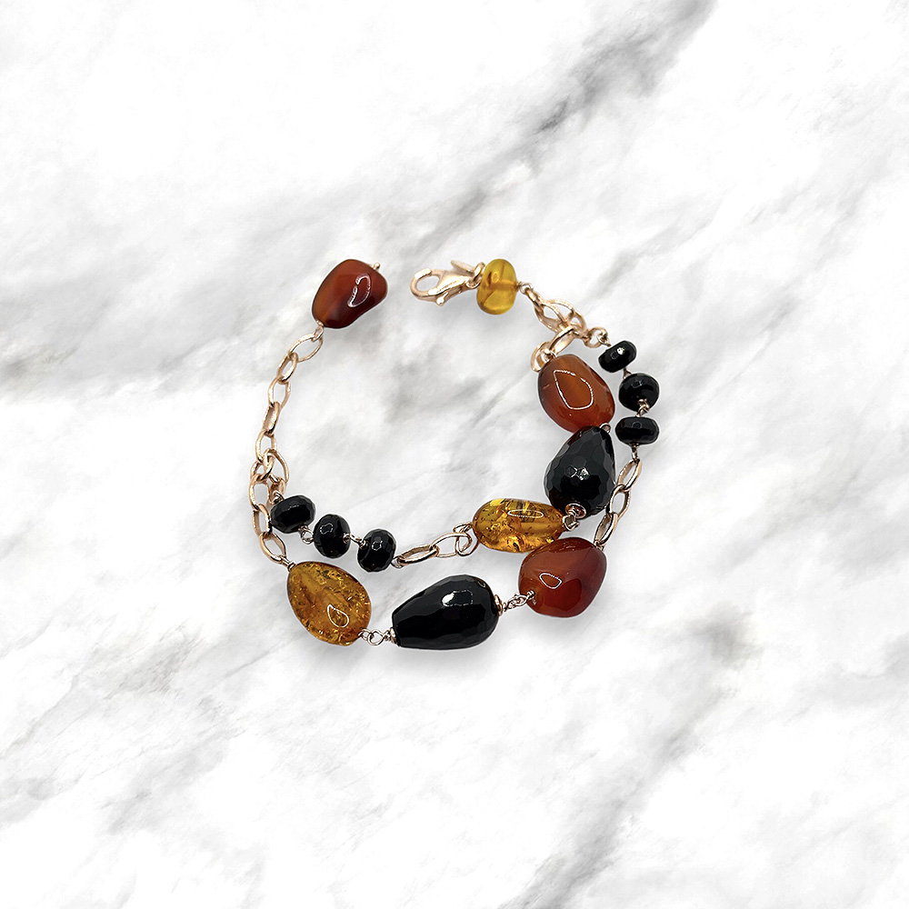 Bracciale doppio filo made in Italy in argento rosa 925 con ambra, spinello nero e corniola naturali.