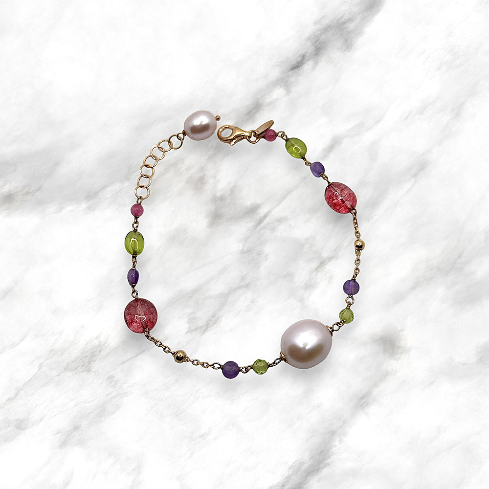 Bracciale argento rosa con peridoto, ametista e perla coltivata