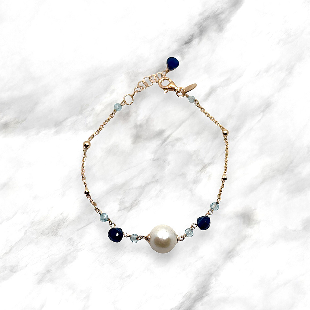 Bracciale made in Italy in argento rosa 925 con topazi azzurri, london e perla centrale sferica naturali.
