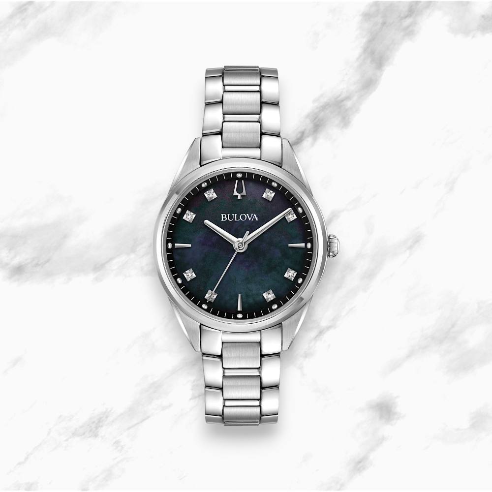 Orologio al quarzo dal design elegante con quadrante in madreperla nero e diamanti