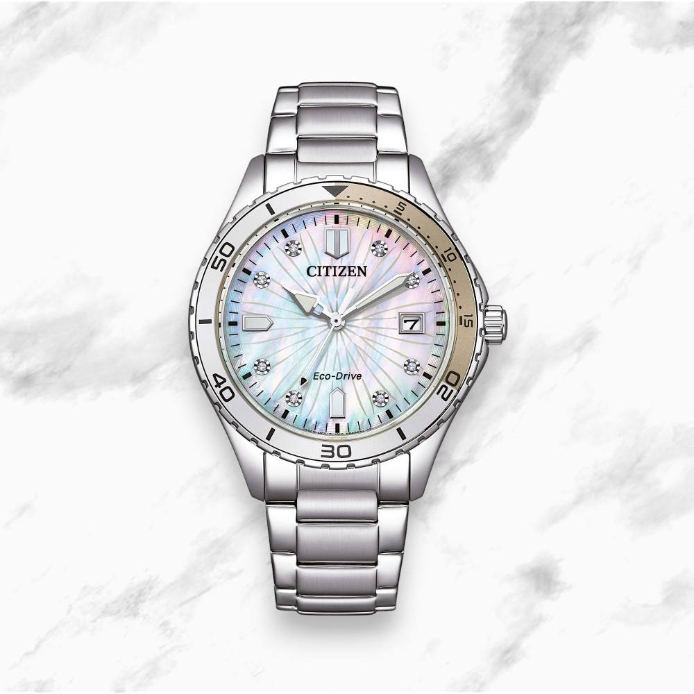 Movimento: Eco Drive Dimensioni della cassa: 37mm Colore quadrante: Madreperla Materiale della cassa: Acciaio Vetro: Minerale Tipo di quadrante: Analogico Impermeabilità: 10 bar (100m)