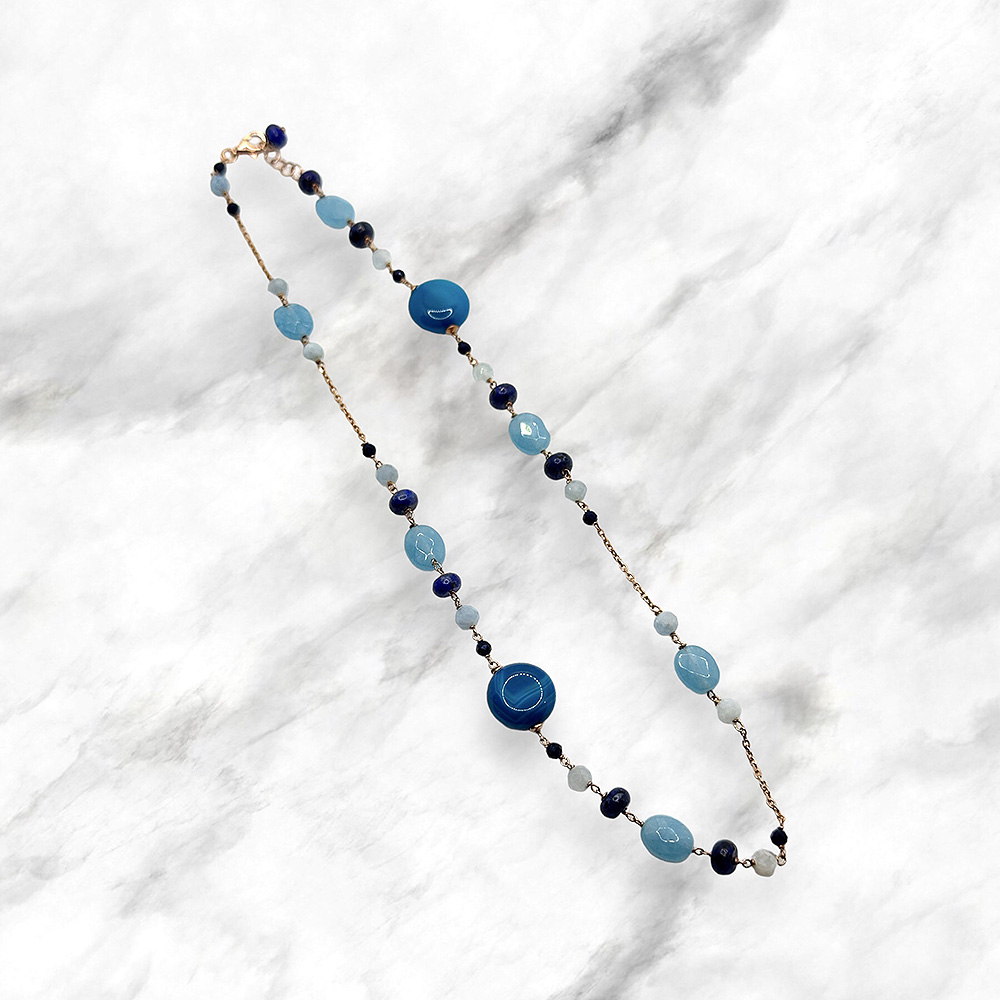 Collana argento rosa con acqua marina, lapis e topazio blu
