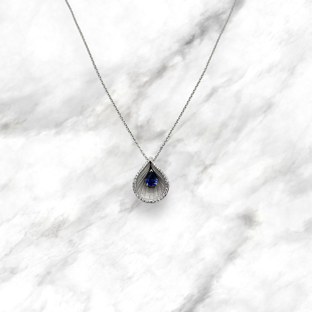 Collana Annamaria Cammilli made in Italy in oro bianco 18kt lucido e sabbiato, collezione ‘Calla’ con zaffiro blu taglio goccia centrale e diamanti naturali taglio brillante.
