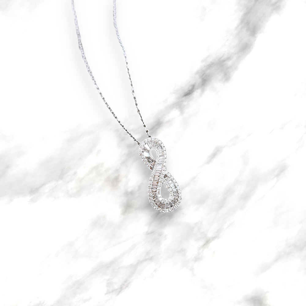 Collana made in Italy in oro bianco 18kt con ciondolo in diamanti naturali taglio brillante all’esterno e diamanti naturali taglio baguettes all’interno