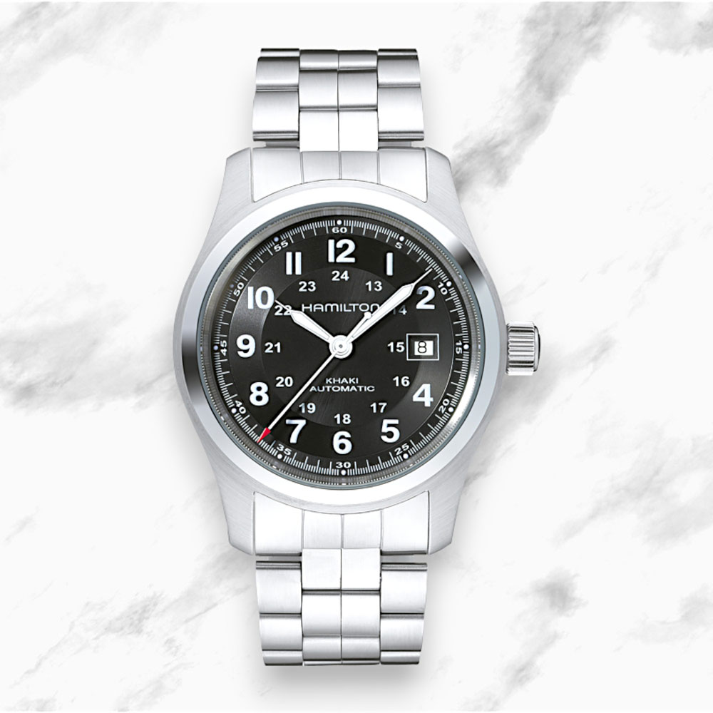 Il Khaki Field Auto soddisferà ogni tua esigenza con l’esclusivo calibro automatico H-10 che garantisce una riserva di carica fino a 80 ore.