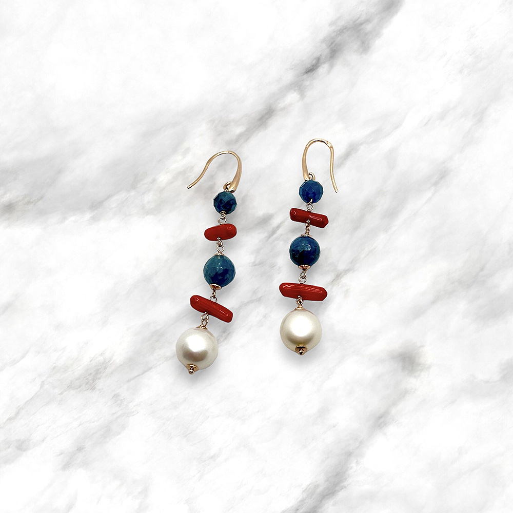 Orecchini made in Italy in argento rosa 925 con corallo, topazio london e perle barocche naturali.
