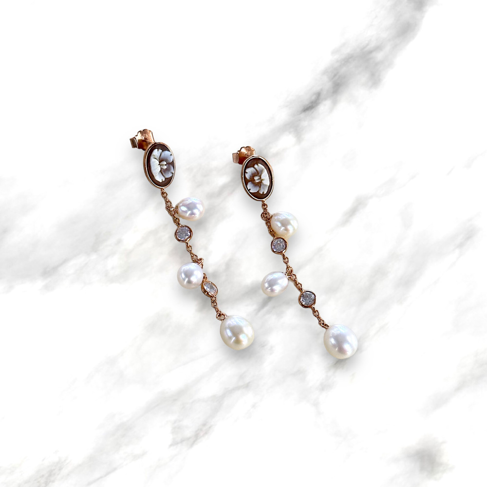 Orecchini pendenti realizzati in Italia da orafi esperti con cameo (corniola naturale) floreale, cubic zirconia e perle coltivate.
