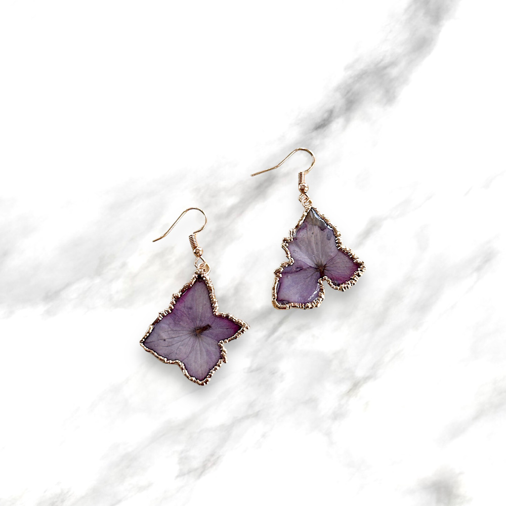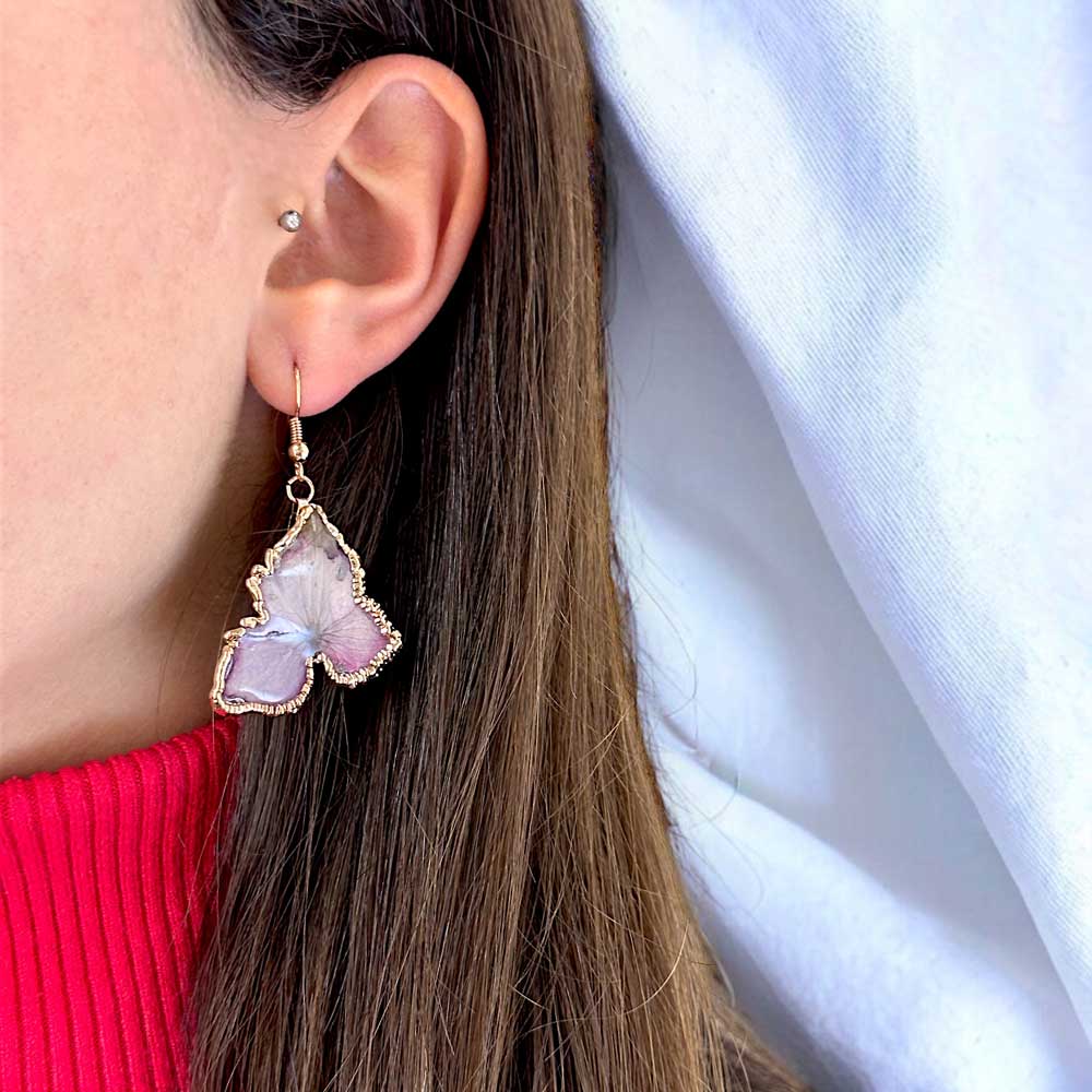 Orecchini pendenti in argento rosa 925 e foglie vere di ortensia